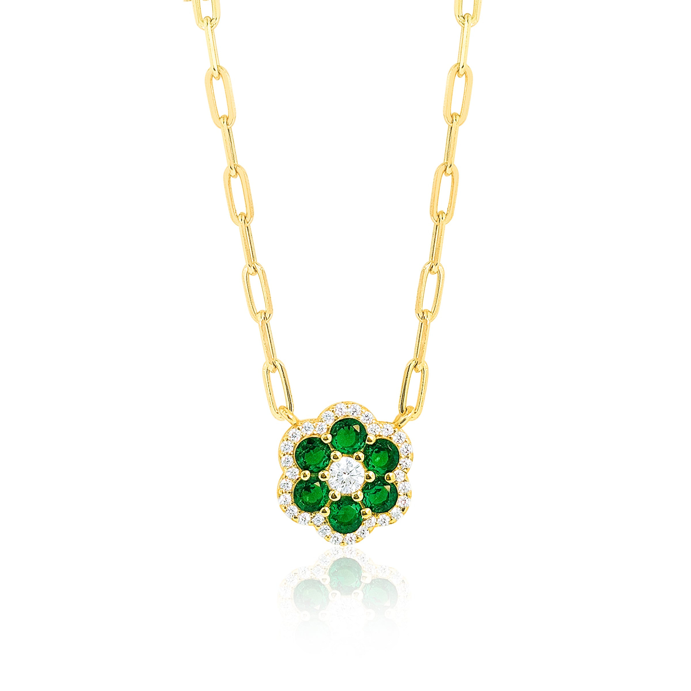 Vermeil Paperclip Created Emerald and CZ Flower Rose Layering Necklace